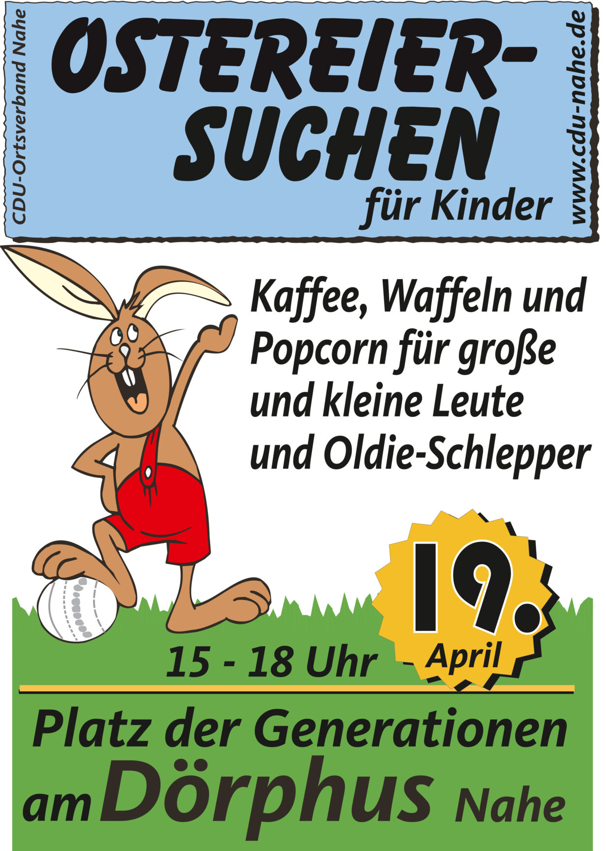 Ich freue mich auf viele Kinder. – Am Ostersonnabend, 19. April gibt es bei der Ostereiersuche von 15 bis 18 Uhr einen CDU-Familienspaß für große und kleine Leute auf dem …